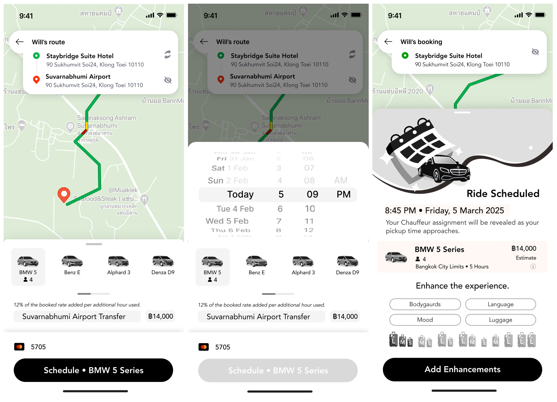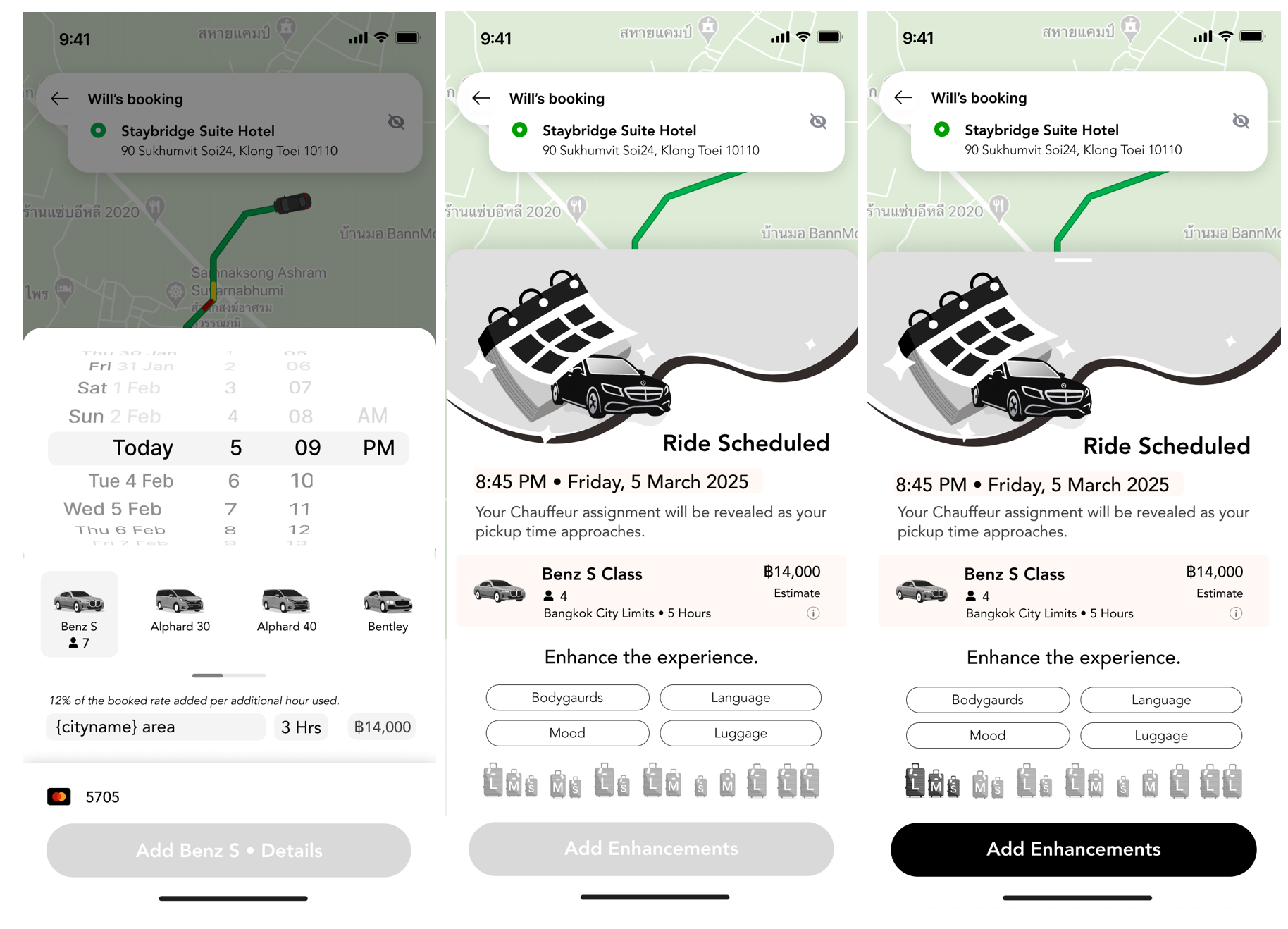 The Add Enhancement button stays disabled until enhancements—such as bodyguards, language, mood, or luggage—are selected to personalize your ride. Once you choose these options, the Add Enhancement button will be enabled. Your ride is scheduled immediately when you tap the Add Enhancement button.
