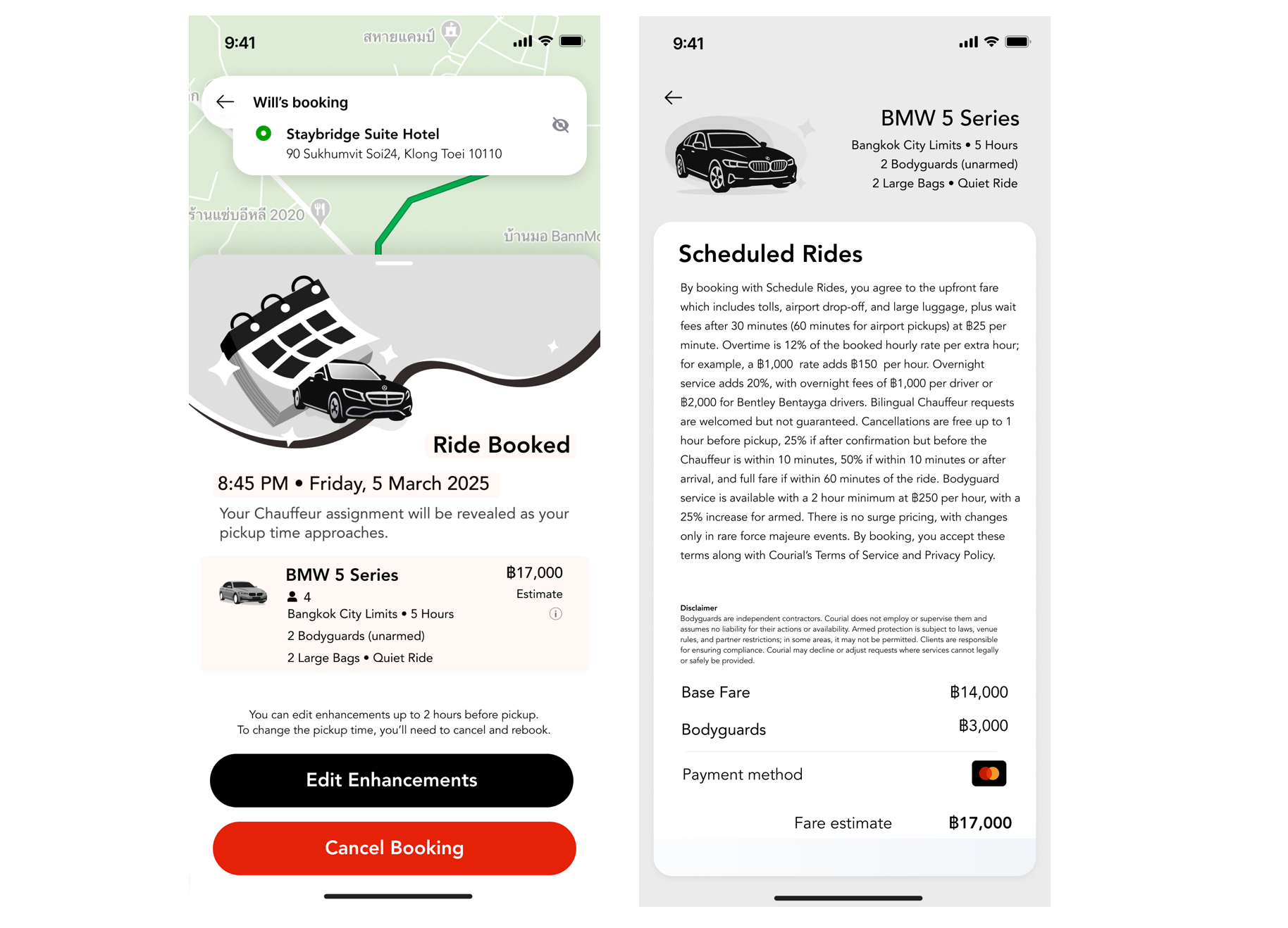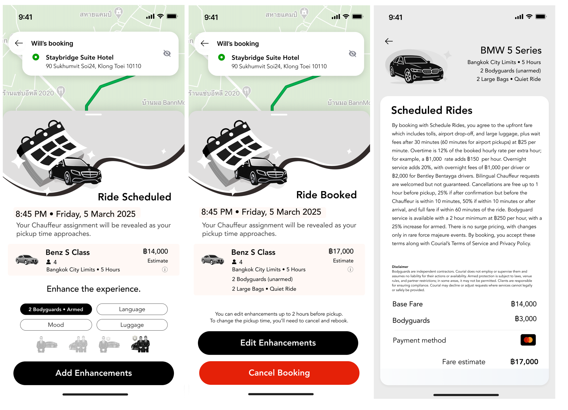- on Tap Add Enhancement button, New screen will appear it will have all ride info including dates, car , fare total, selected enhancements and two buttons Edit Enhancements and Cancel booking