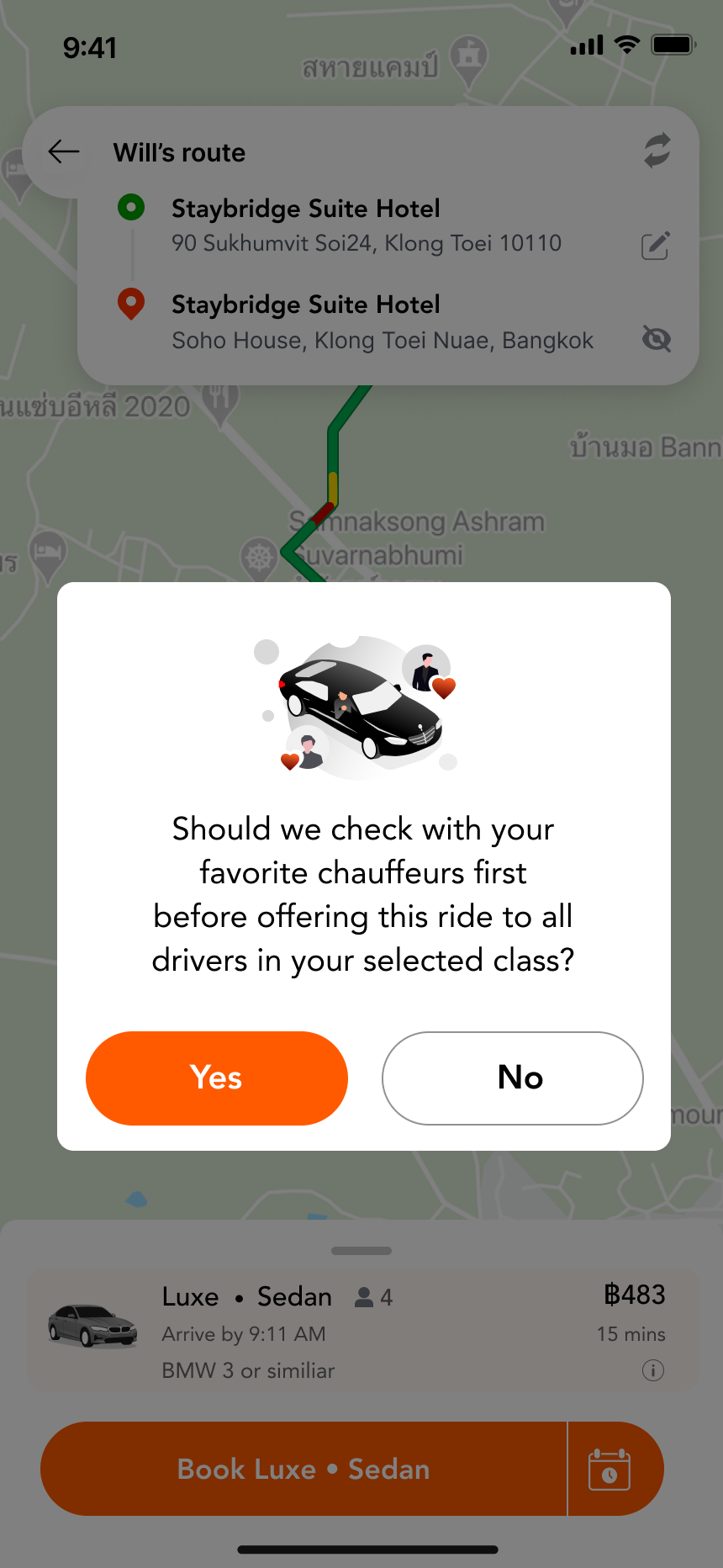 - Tap No to send the request to all available chauffeurs immediately
